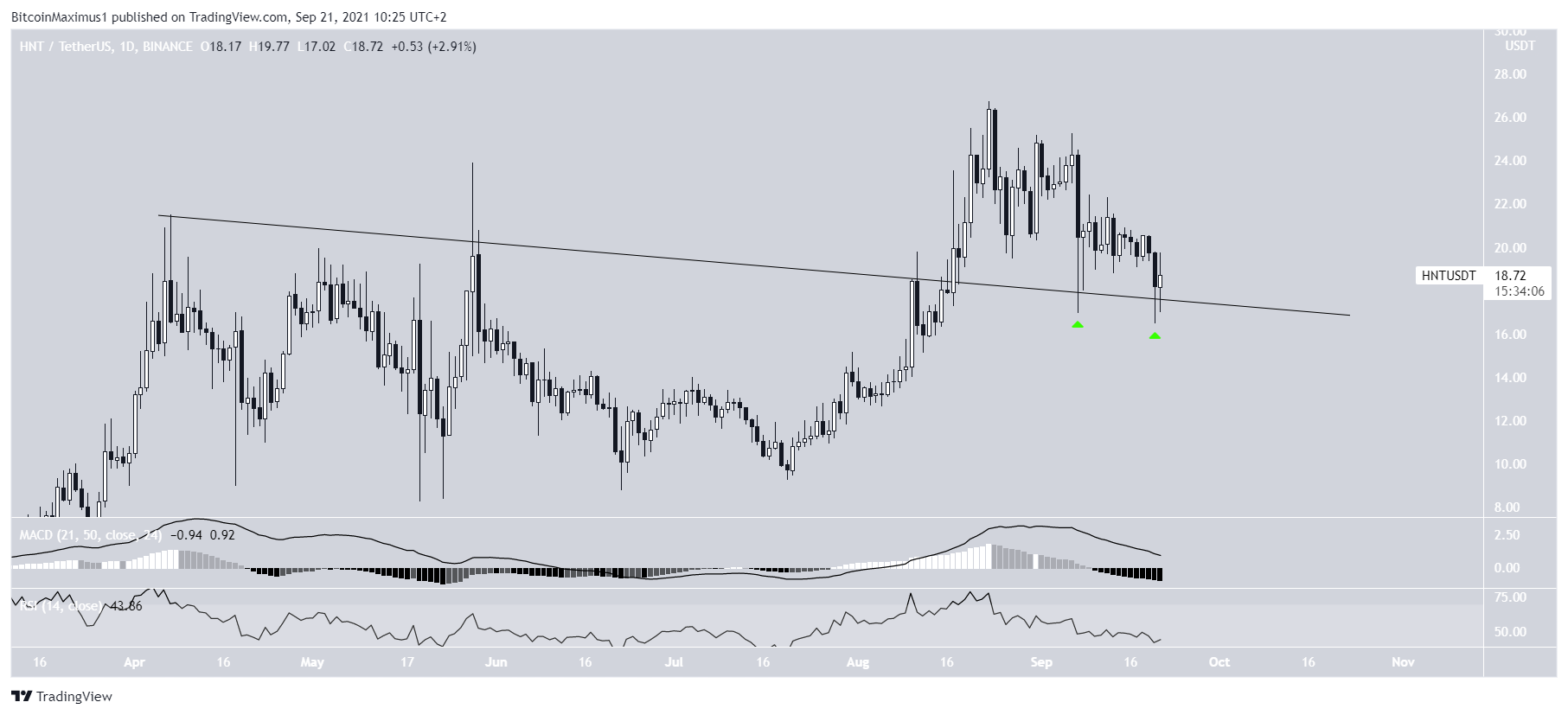 O movimento levou o token a uma nova máxima histórica de US$ 26,73 em 23 de agosto. Embora o HNT tenha caído desde então, ele validou duas vezes a linha de tendência de baixa como suporte (ícones verdes).