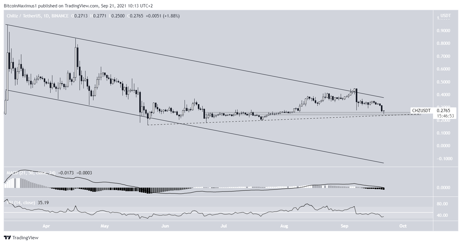 Embora os indicadores técnicos não mostrem quaisquer sinais de reversão de alta, a CHZ é negociada logo acima de uma confluência de níveis de suporte criados pela área horizontal de US$ 0,25 e uma linha de tendência de alta.