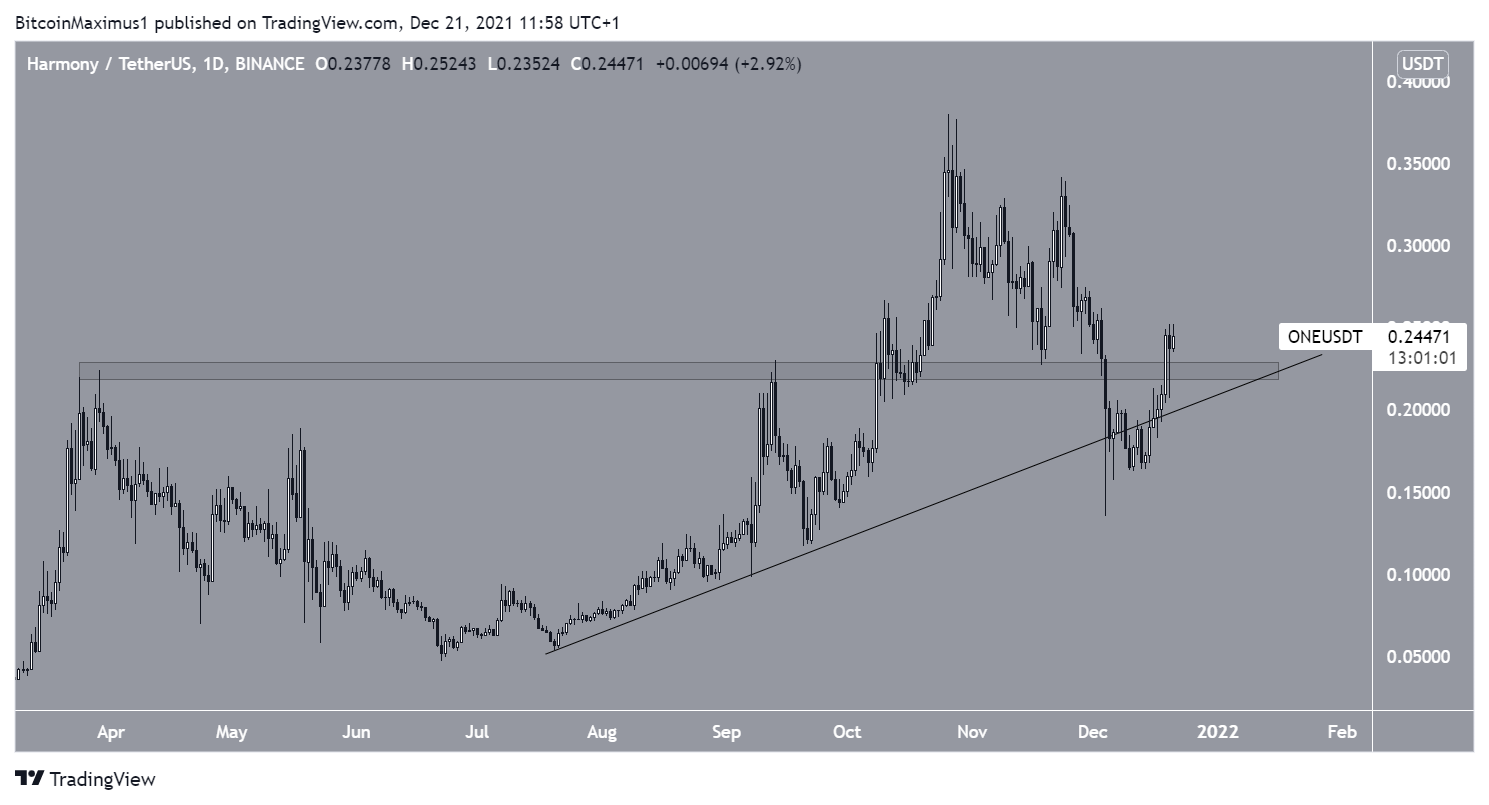 ONE tem caído desde que atingiu o preço recorde de US$ 0,38 em 26 de outubro. O movimento de queda levou a uma mínima de US$ 0,135 em 4 de dezembro. Isso aparentemente causou o rompimento de uma linha de tendência de alta de longo prazo.