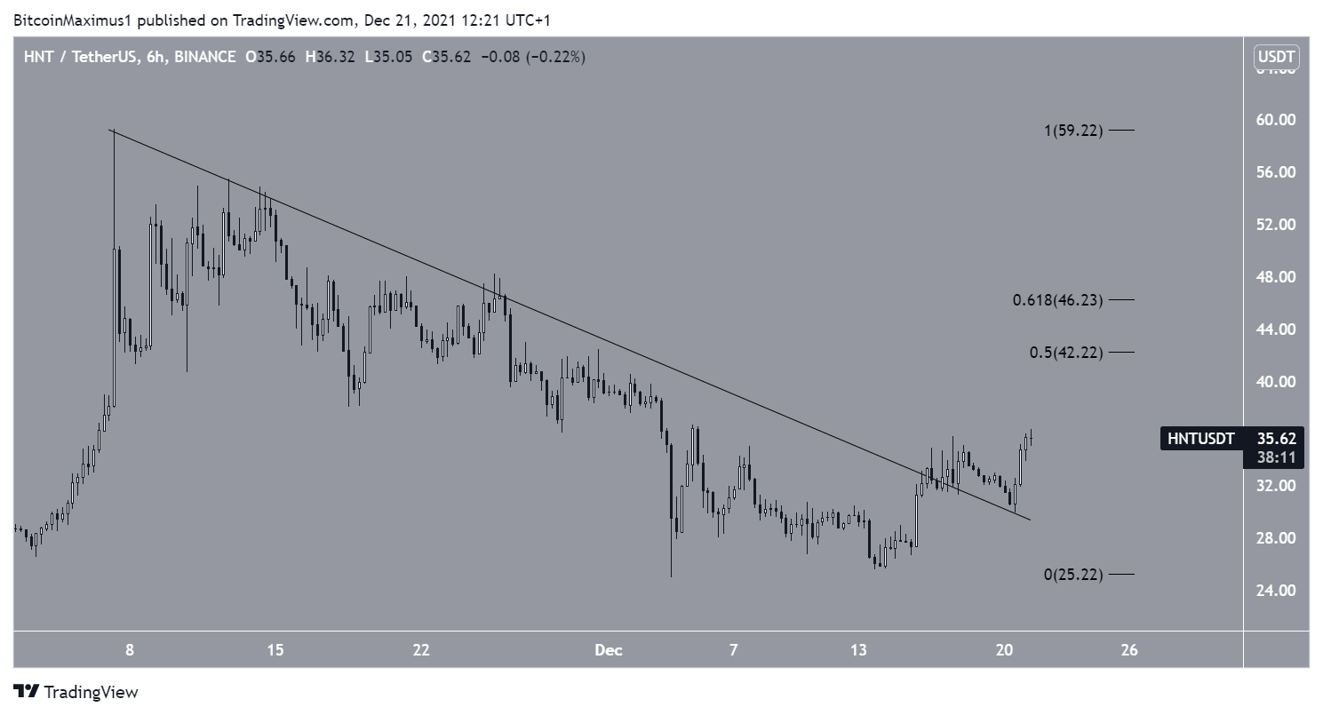 HNT está sendo negociada abaixo de uma linha de tendência de baixa desde que atingiu uma nova máxima histórica em 7 de novembro. Isso levou a uma mínima de US$ 25 em 4 de dezembro. O token conseguiu se recuperar e rompeu acima dessa linha na última quinta-feira (16).