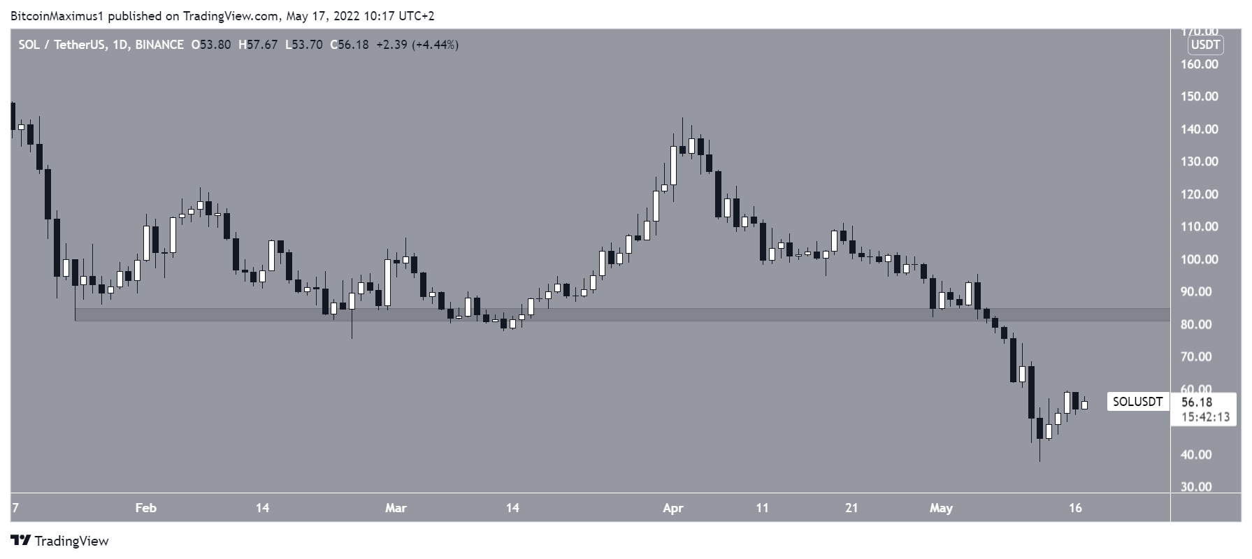 No entanto, o preço da criptomoeda vem caindo desde então e perdeu a área de US$ 83 em 7 de maio, atingindo a mínima de US$ 37,37 cinco dias depois. Até que a SOL consiga recuperar a área de US$ 83, a tendência não pode ser considerada de alta.