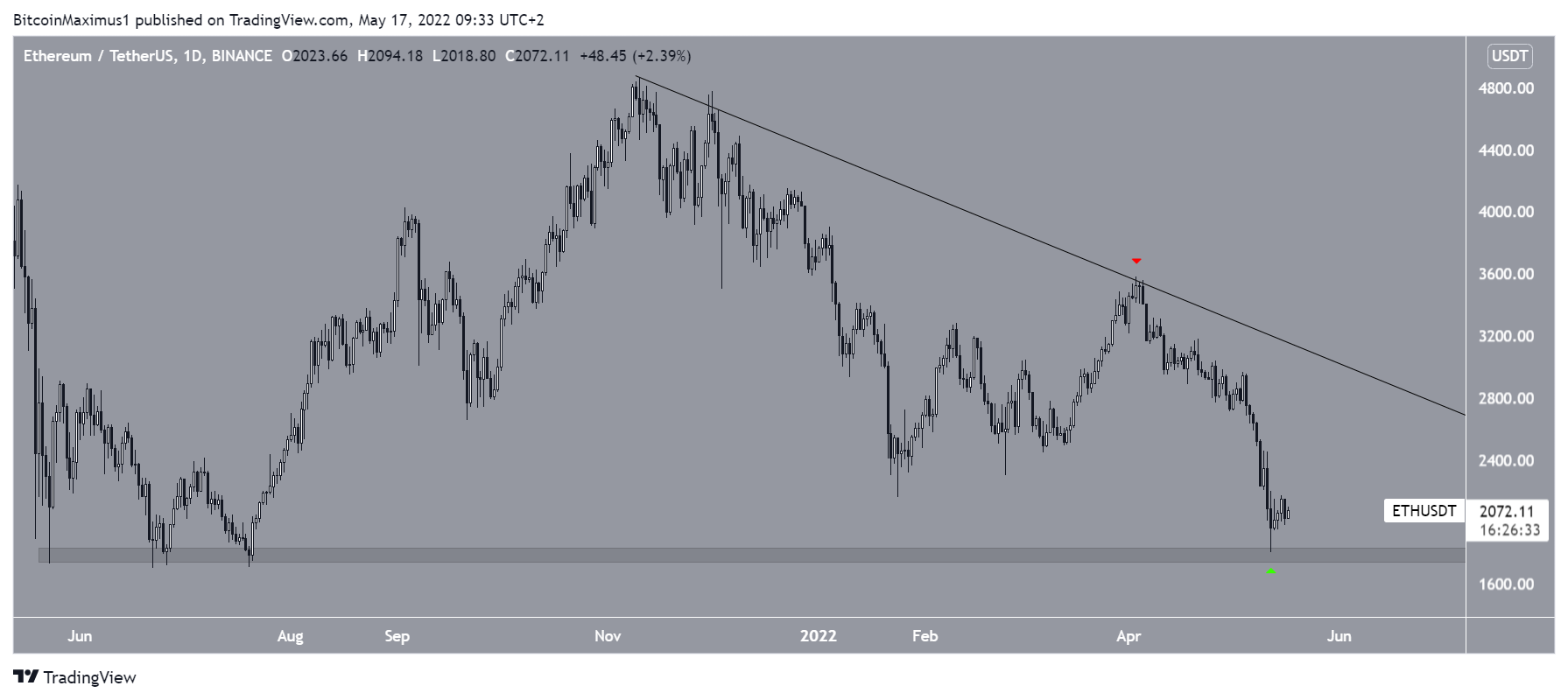O Ethereum (ETH) está seguindo uma linha de tendência de baixa desde novembro de 2021. Mais recentemente, a linha causou uma queda de preço em abril (ícone vermelho).