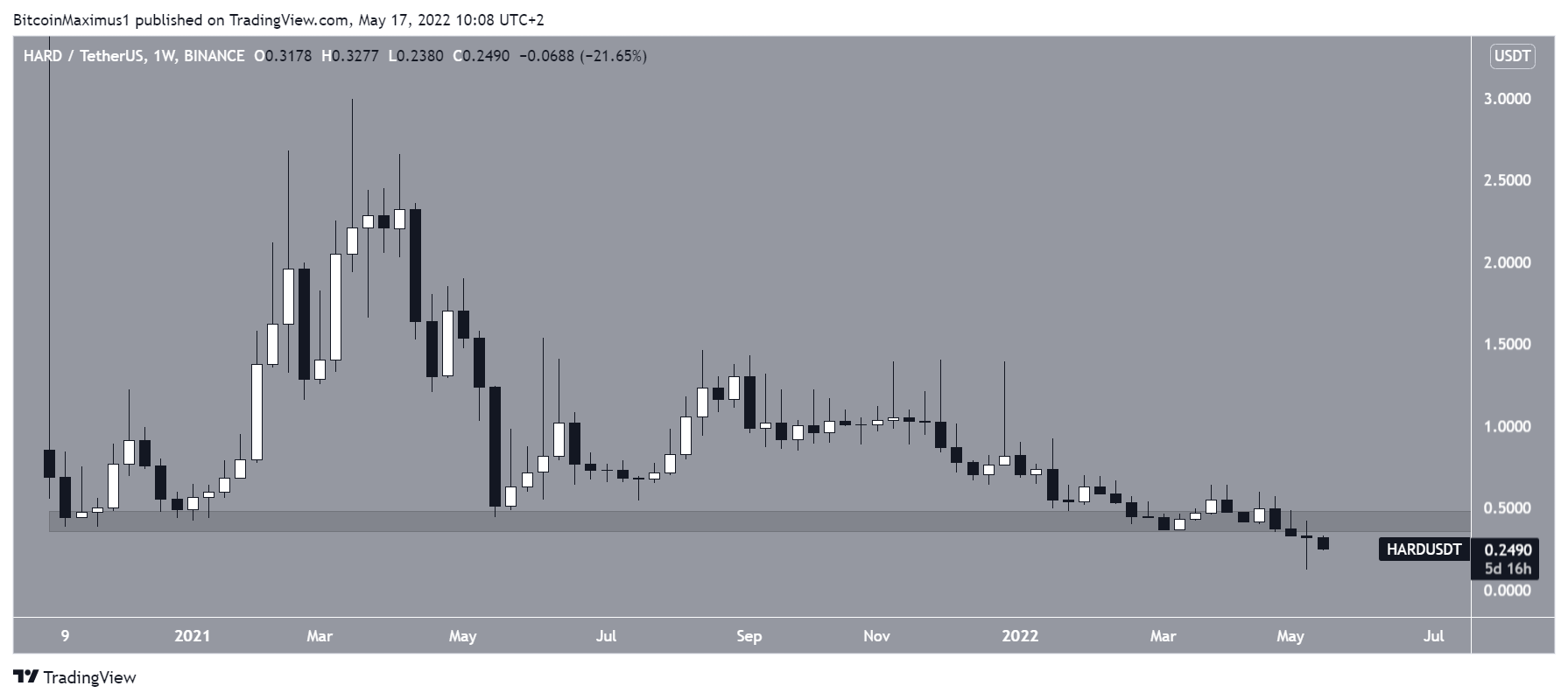 Desde novembro de 2020, o Kava Lend (HARD) estava acima da área de suporte horizontal de US$ 0,40. O preço caiu no início de maio e atingiu a mínima de US$ 0,12 na última quinta-feira.