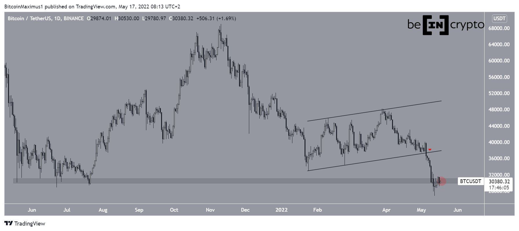 Em 5 de maio (ícone vermelho), o Bitcoin (BTC) caiu abaixo de um canal paralelo de alta. Ele passou a atingir a mínima de US$ 26.700 na última quinta-feira (12).