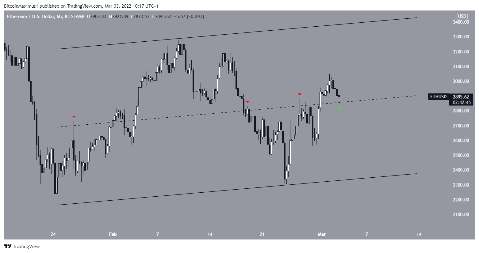 O ETH está subindo desde 24 de janeiro e é possível que o preço esteja sendo negociado dentro de um canal paralelo de alta. A linha média do canal atuou anteriormente como resistência (ícones vermelhos), mas o token conseguiu se mover acima da linha na segunda-feira (28).