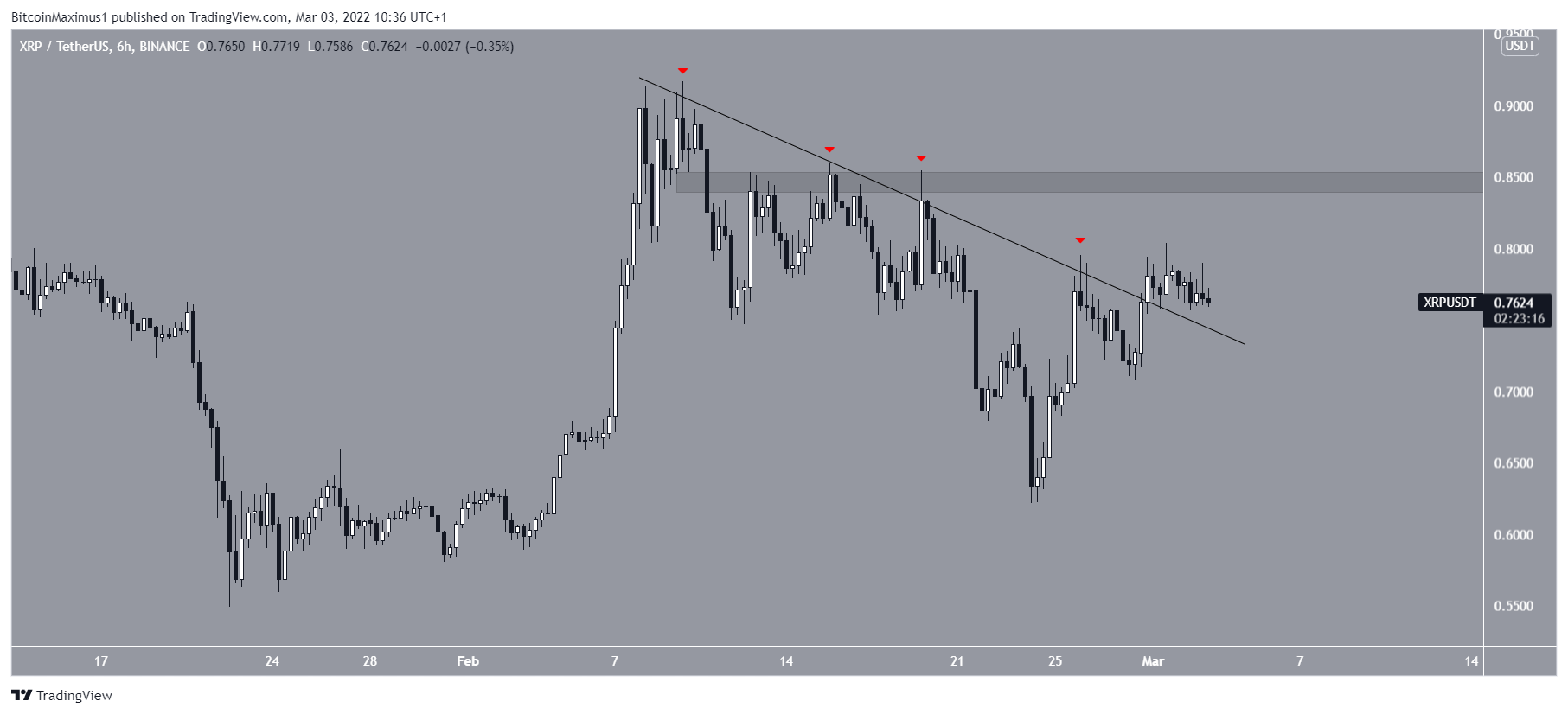 O XRP estava seguindo uma linha de tendência de baixa desde 9 de fevereiro. Ele foi rejeitado por essa linha quatro vezes, a mais recentemente na última sexta-feira (26). No entanto, o ativo conseguiu romper essa linha na terça-feira.