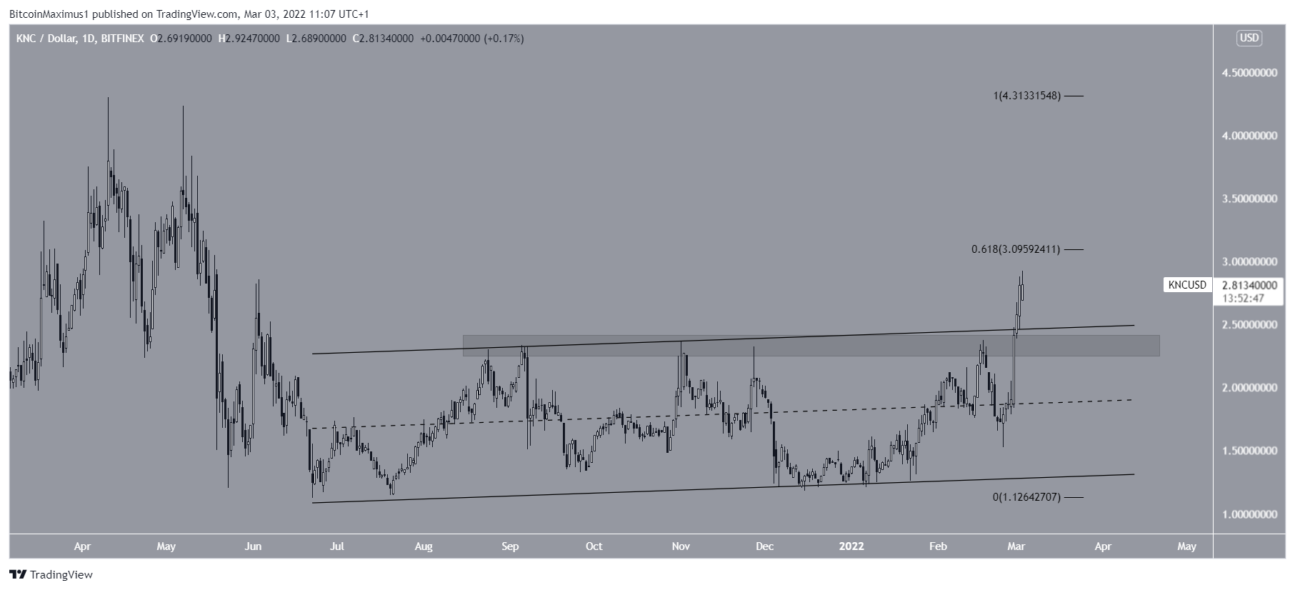 A KNC estava dentro de um canal paralelo de alta desde 22 de junho de 2021. Na terça-feira, o token finalmente rompeu acima da resistência do canal e da área de resistência horizontal de US$ 2,30.