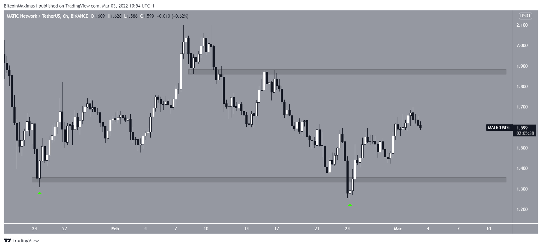 Entre janeiro e 24 de fevereiro, a MATIC atingiu mínimas próximas a US$ 1,30 (ícones verdes). A segunda pareceu fazer com que o preço caísse abaixo da área de suporte horizontal de US$ 1,35.
