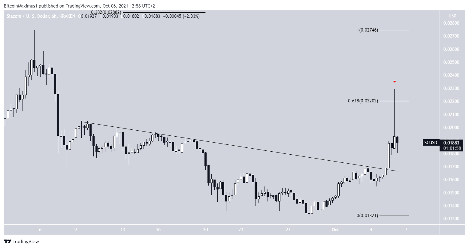 O THETA (THETA) rompeu uma cunha de baixa, mas ainda não recuperou a área de resistência de US$ 6,90. Por fim, o Siacoin (SC) rompeu uma linha de tendência de baixa, mas não conseguiu ultrapassar o nível de retração de 0,618 de Fibonacci.
