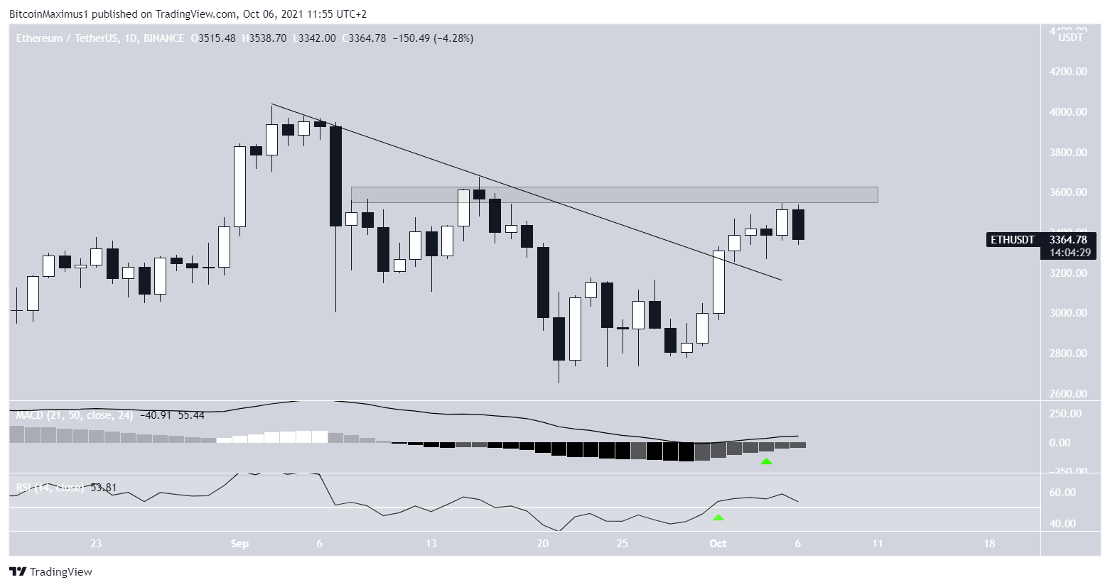 A ETH está mostrando um movimento muito parecido com o Bitcoin. No entanto, há uma diferença notável no fato de que a criptomoeda ainda não se moveu acima da área de resistência horizontal de US$ 3.600. Portanto, é possível dizer que o ativo está espelhando o movimento do BTC com um ligeiro atraso.