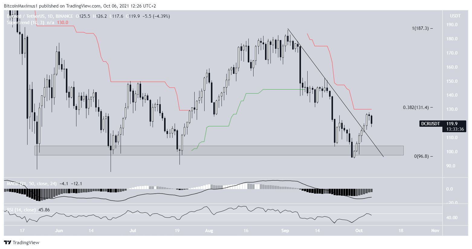 O DCR seguia uma linha de tendência de baixa desde o dia 2 de setembro, quando atingiu uma alta de US$ 186. Embora o ativo tenha conseguido romper essa linha no domingo, a tendência ainda não é de alta.