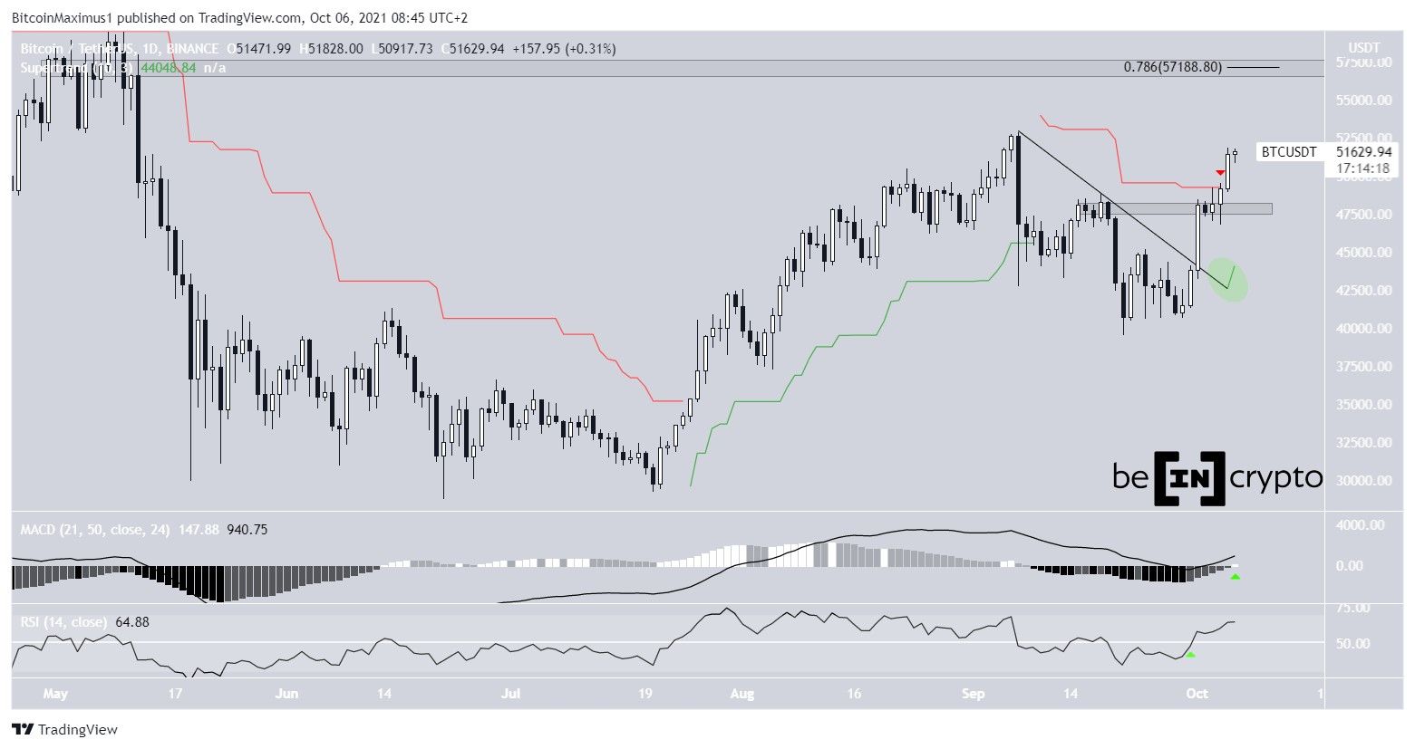 A alta foi acentuada no domingo (3), já que o BTC cresceu acima da área de US$ 47.600 e, em seguida, ultrapassou a linha de resistência da supertrend (ícone vermelho). Espera-se agora que a área de US$ 47.600 atue como suporte se o ativo retornar a ela, enquanto a Supertrend se tornou de alta (círculo verde).