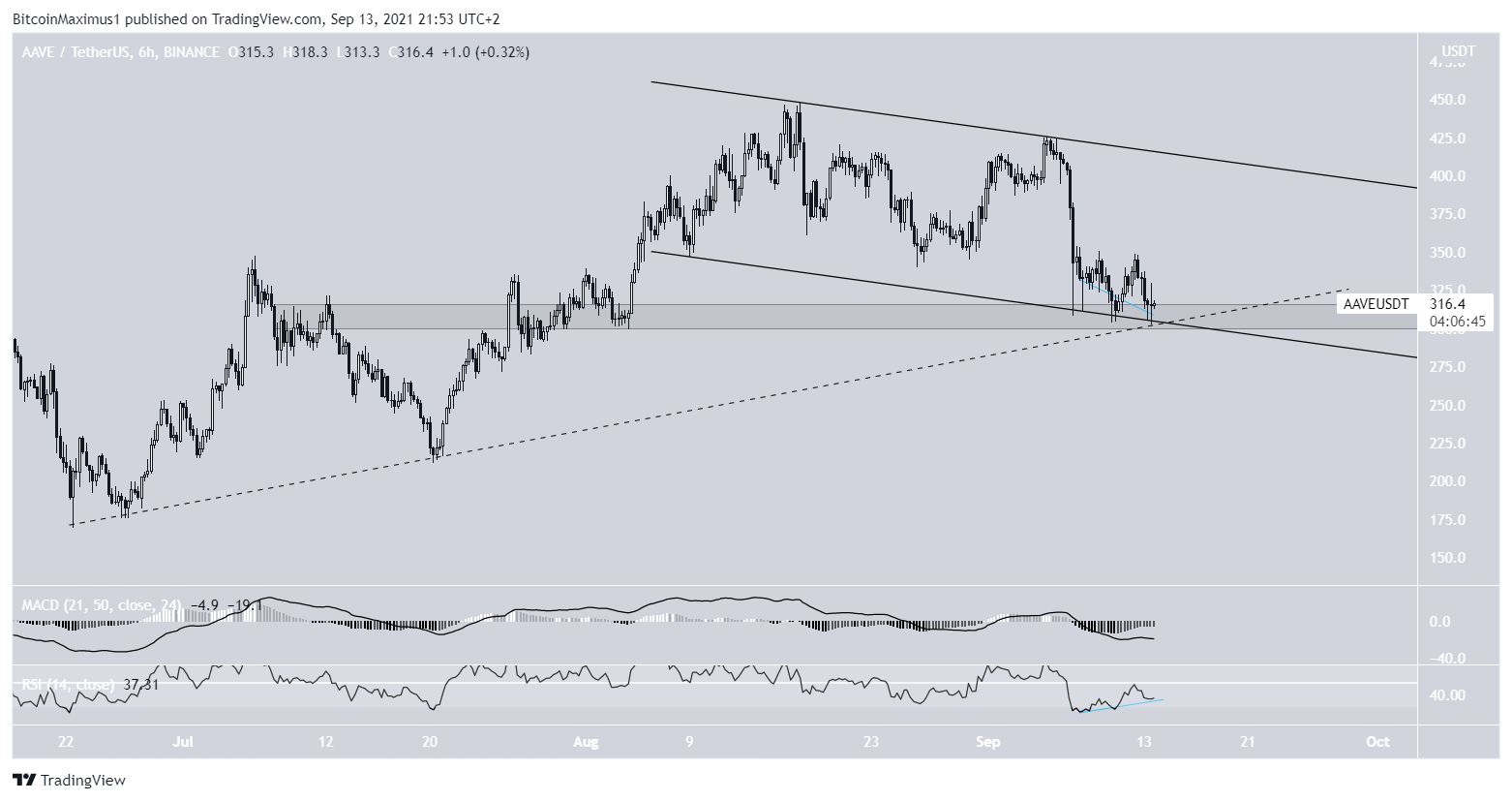 O AAVE é negociado dentro de um canal paralelo de baixa desde que atingiu uma máxima de US$ 443 no dia 17 de agosto.