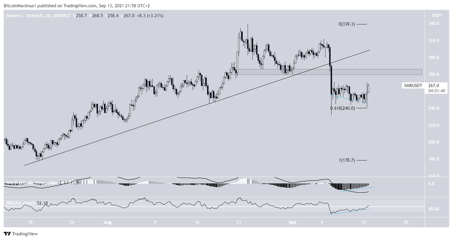 O XMR seguia uma linha de tendência de alta desde o dia 20 de julho. Isso levou o ativo a atingir uma alta de US$ 339,70 no dia 24 de agosto.
