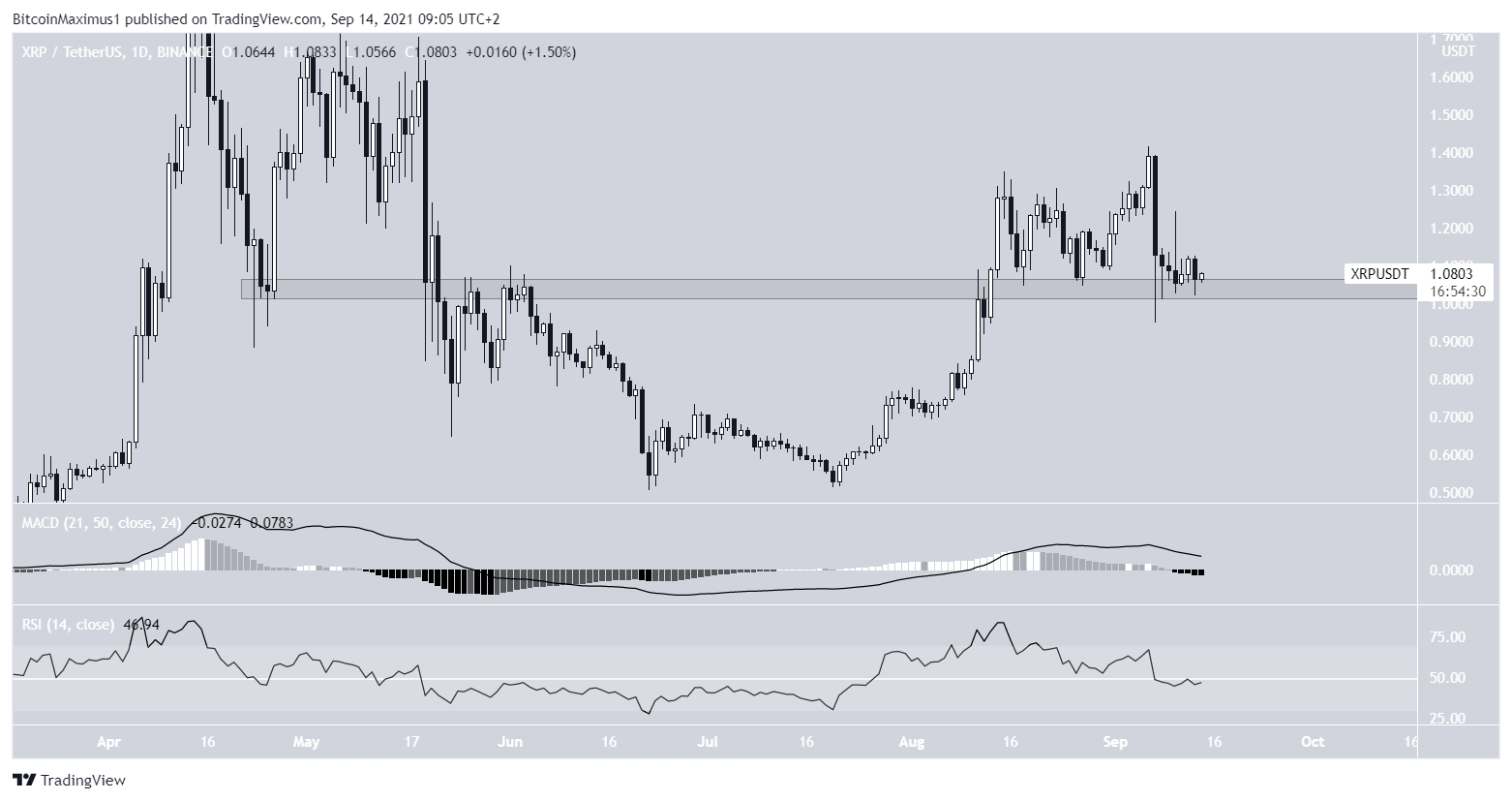 Apesar de ainda estar acima do suporte, os indicadores técnicos são de baixa. O MACD e o RSI estão caindo e este último está abaixo de 50. Portanto, o XRP pode cair após um movimento de alta de curto prazo.