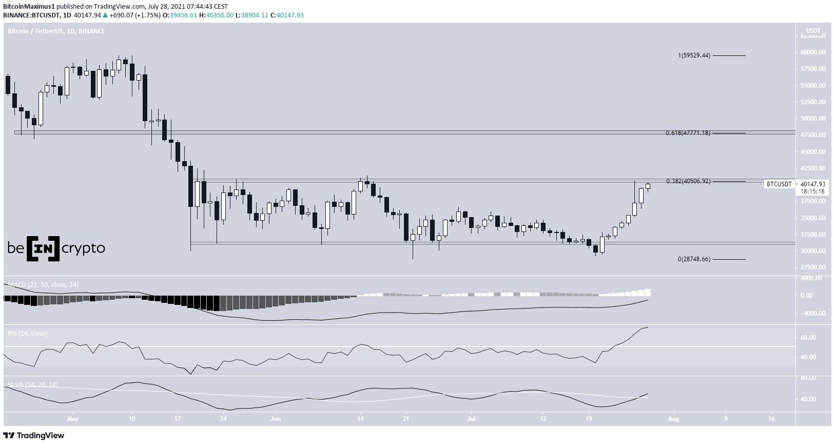 O BTC está subindo desde 20 de julho. A criptomoeda atingiu a área de resistência de US$ 40.550 em 26 nesta segunda-feira (26), mas não conseguiu ultrapassa-la. O movimento criou um longo pavio superior.
