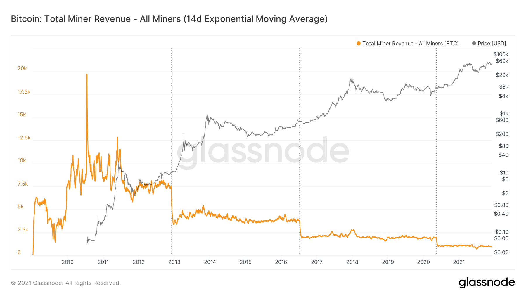 A receita total dos mineradores cai pela metade a cada quatro anos, conforme indicado pelas linhas verticais pontilhadas. Isso ocorre devido ao halving, evento que reduz pela metade a quantidade de BTC minerada em cada bloco. O halving mais recente ocorreu em maio de 2020.
