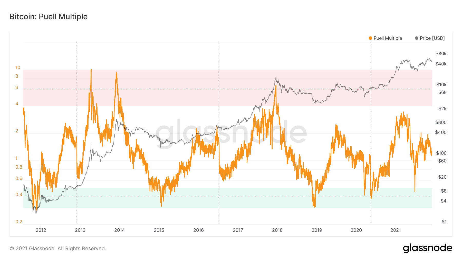 O Puell Multiple é um indicador criado pela divisão do valor de todas as moedas de Bitcoin cunhadas por uma média móvel anual.