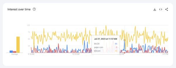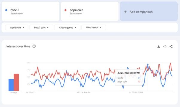 O Google Trends mede o interesse do termo de pesquisa ao longo do tempo em uma escala de 0 a 100, sendo 100 o nível mais alto de interesse. Em todo o mundo, nos últimos sete dias, ‘btc20’ vem disputando a supremacia do setor com ‘pepe coin’. De fato, em datas e horários específicos, o BTC20 teve maior interesse de pesquisa do que o Pepe, como mostra o gráfico abaixo: