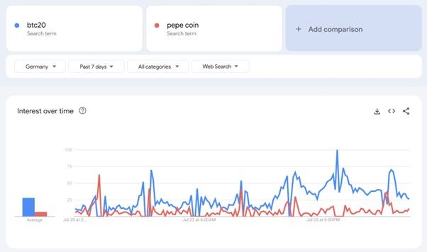 Mais uma vez, olhando para os resultados alemães, desta vez nos últimos sete dias, ‘btc20’ supera consistentemente ‘pepe coin’, com o nível de desempenho superior crescendo à medida que cresce o interesse no BTC20.