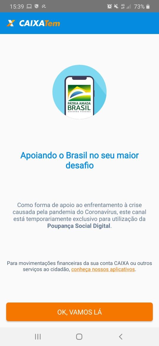 Ao entrar no aplicativo, o usuário recebe uma mensagem sobre o auxílio-emergencial. Ao clicar em “OK, VAMOS LÁ”, ele é direcionado à “sala de espera virtual”, na qual há uma fila de espera para acessar a conta.