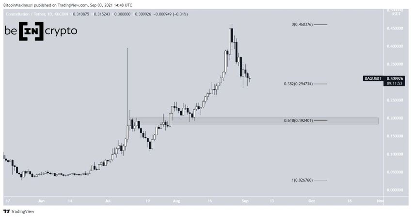 No entanto, o DAG está em queda desde então. Atualmente, ele é negociado um pouco acima do nível de suporte de retração de Fibonacci de US$ 0,382 em US$ 0,294. Se o nível não se manter, existe um forte suporte em US$ 0,192. Este é o nível de suporte de retração Fibonacci de 0,618 e uma área de suporte horizontal.