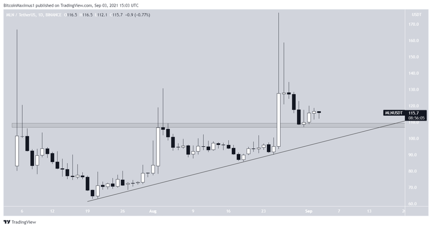 O MLN tem cresceu ao lado de uma linha de suporte ascendente desde o dia 21 de julho. Embora tenha sido inicialmente rejeitada pela área de resistência de US$ 108, ela conseguiu estourar em meio a um grande vela de alta em 26 de agosto.
