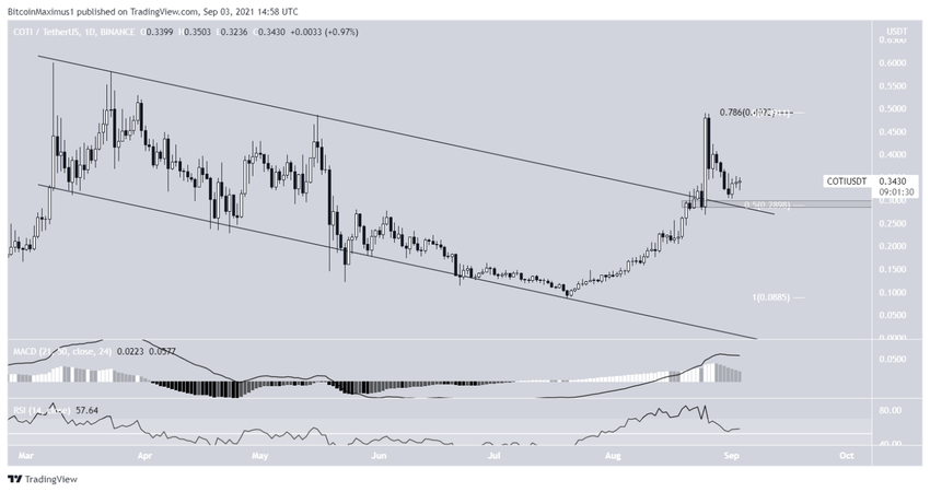 Em 25 de agosto, o COTI saiu de um canal paralelo descendente e atingiu uma alta de US$ 0,49.