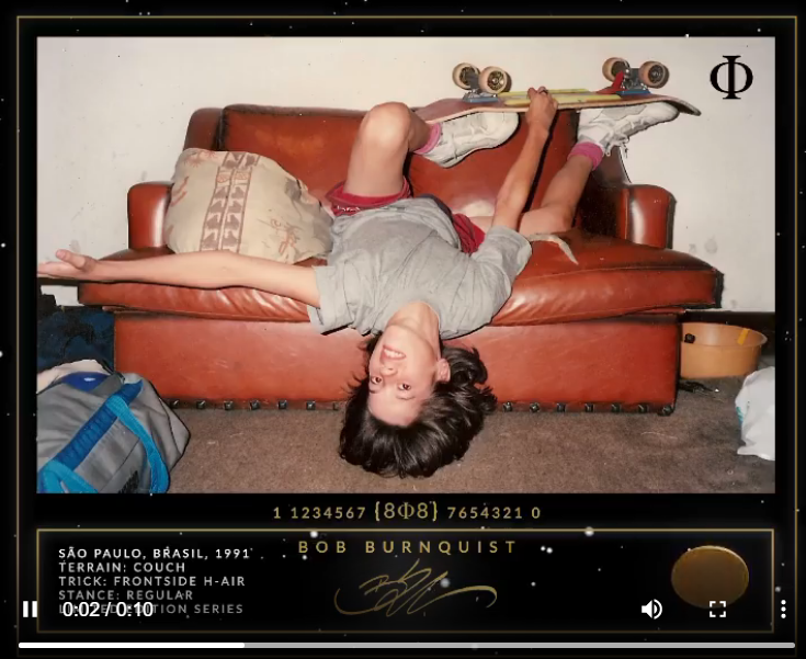 E, depois dessa foto, adicionei vídeos nesses cards colecionáveis, influenciado também pelos NFTs do NBA Top Shot ,com os destaques de grandes jogadas colocadas em NFTs em várias edições, então fiz um de vídeo de uma manobra na Dreamland [mega rampa para prática de skate construída na casa do skatista em Vista, Califórnia, Estados Unidos]. no meu quintal que ficou bem legal.Então, esse é o início de uma coleção.