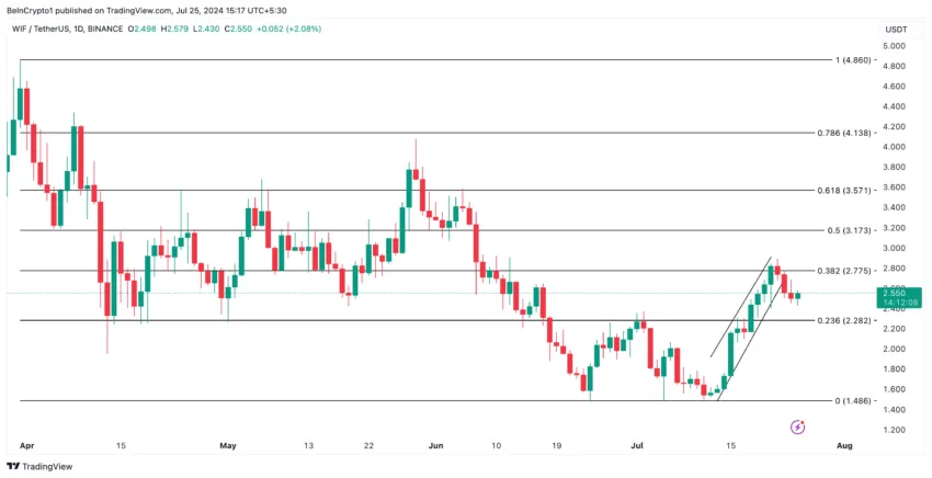 O gráfico diário revelou que a WIF estava negociada em um canal de alta entre 14 e 23 de julho. Durante esse período, o preço da moeda meme subiu 83%.