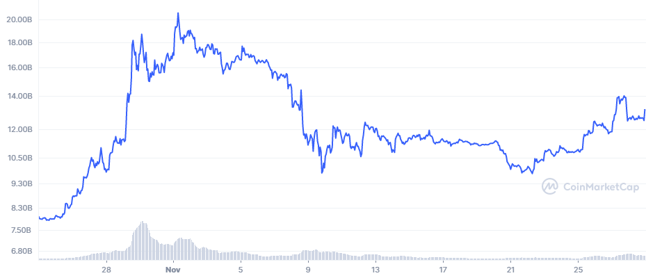 Ainda assim os resultados registrados nas últimas semanas são otimistas. A capitalização de mercado da DOGE aumentou de US$ 7,93 bilhões para US$ 13,2 bilhões, com um influxo médio de US$ 1 bilhão por semana nas últimas cinco semanas. Já o volume disparou de US$ 216 milhões para US$ 844 milhões no mesmo período, totalizando um aumento de 290%.