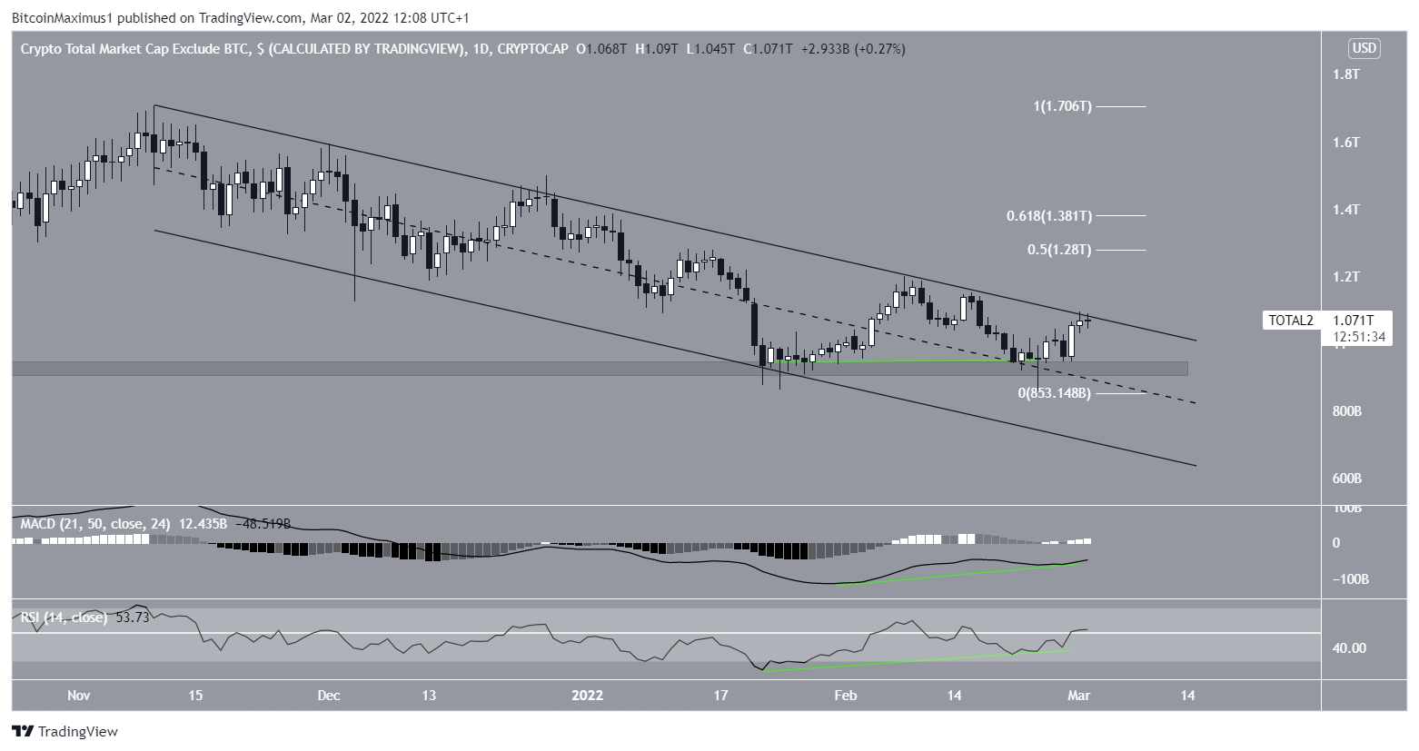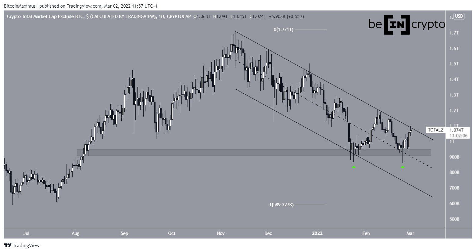 O valor de mercado das altcoins (ALTCAP) criou um padrão de fundo duplo dentro de uma área de suporte horizontal significativa. Um rompimento do canal paralelo de baixa atual confirmaria que a correção foi concluída.