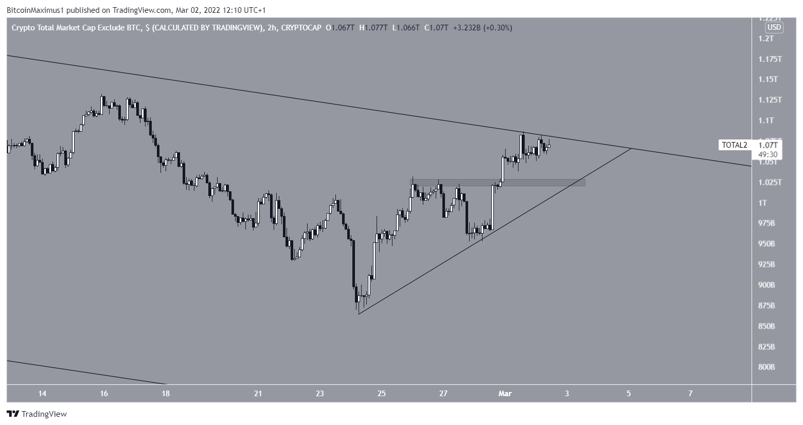 O gráfico de duas horas não mostra nenhum sinal de fraqueza. O valor de mercado das altcoins está seguindo uma linha de tendência de alta e recuperou o nível de US$ 1,02 trilhão que coincide com a linha de tendência e deve fornecer suporte caso ocorra uma queda de curto prazo. Portanto, um rompimento do canal parece ser o cenário mais provável.