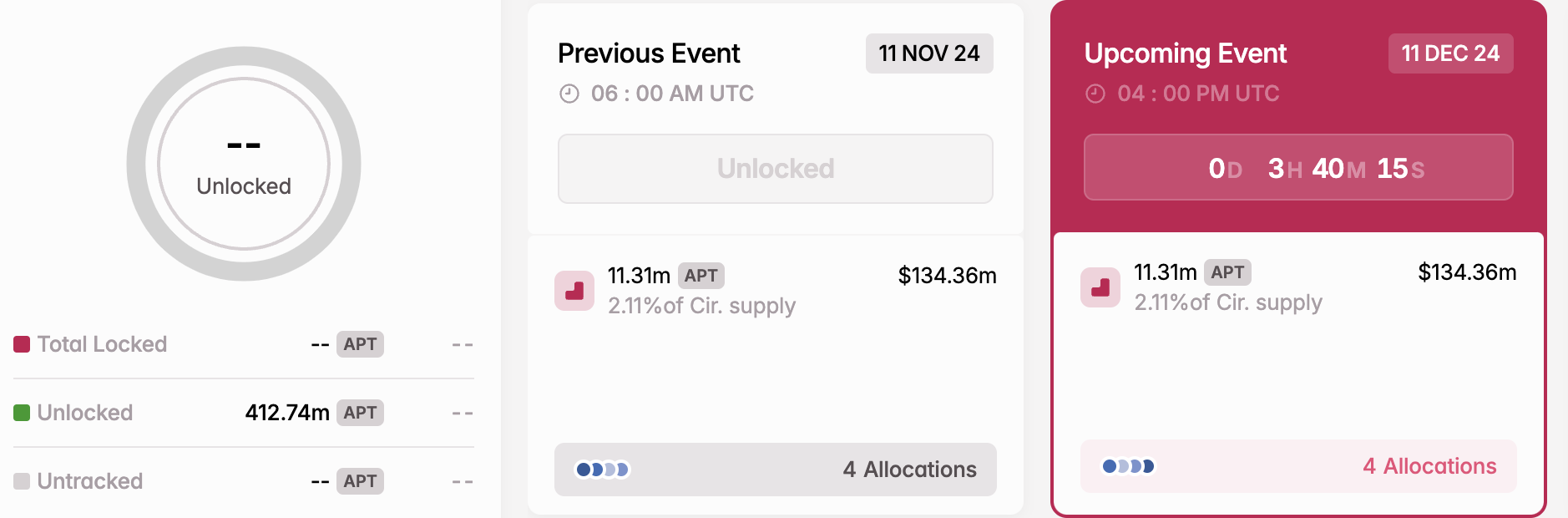 Esse mecanismo desempenha um papel crucial no mercado cripto, garantindo uma distribuição controlada e estratégica de tokens para gerenciar a circulação e a estabilidade do mercado de forma eficaz. De acordo com a Tokenomist (anteriormente Token Unlocks), a Aptos liberará 2,11% de sua oferta total, avaliada em US$ 134,47 milhões hoje.