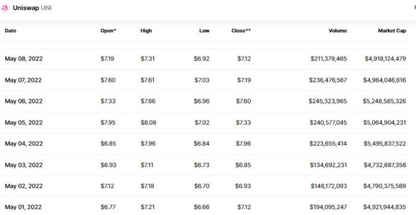 Este foi um declínio de 16% em relação ao valor de mercado no primeiro dia do mês. Em 1º de maio, o UNI registrou um volume de negócios de US$ 194,09 milhões, o que correspondeu a uma capitalização de mercado de cerca de US$ 4,92 bilhões.