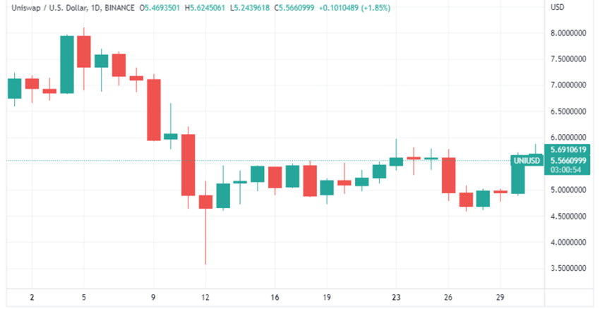 O UNI abriu em 1º de maio, a US$ 6,77, atingiu uma alta mensal de US$ 8,08 em 5 de maio, testou uma baixa mensal de US$ 3,80 e fechou o mês a um preço de US$ 5,70. No geral, isso equivale a uma queda de 15% entre o preço de abertura e fechamento da UNI em maio.