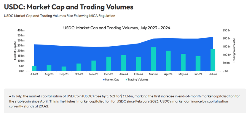 Além disso, em julho, a capitalização de mercado da USD Coin (USDC) teve um aumento de 5,36%, atingindo US$ 33,6 bilhões.