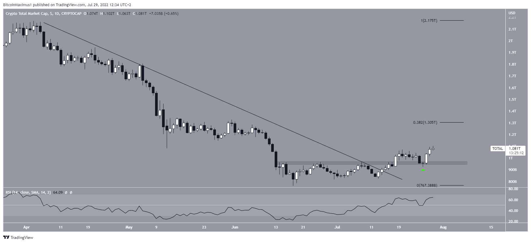 Em primeiro lugar, o TOTALCAP saiu de uma linha de resistência descendente. Em segundo lugar, ultrapassou a área horizontal de US$ 960 bilhões e a validou como suporte (ícone verde). Em terceiro lugar, o RSI saltou na linha de 50 e está atualmente em 63. Todos esses são considerados sinais de uma tendência de alta.