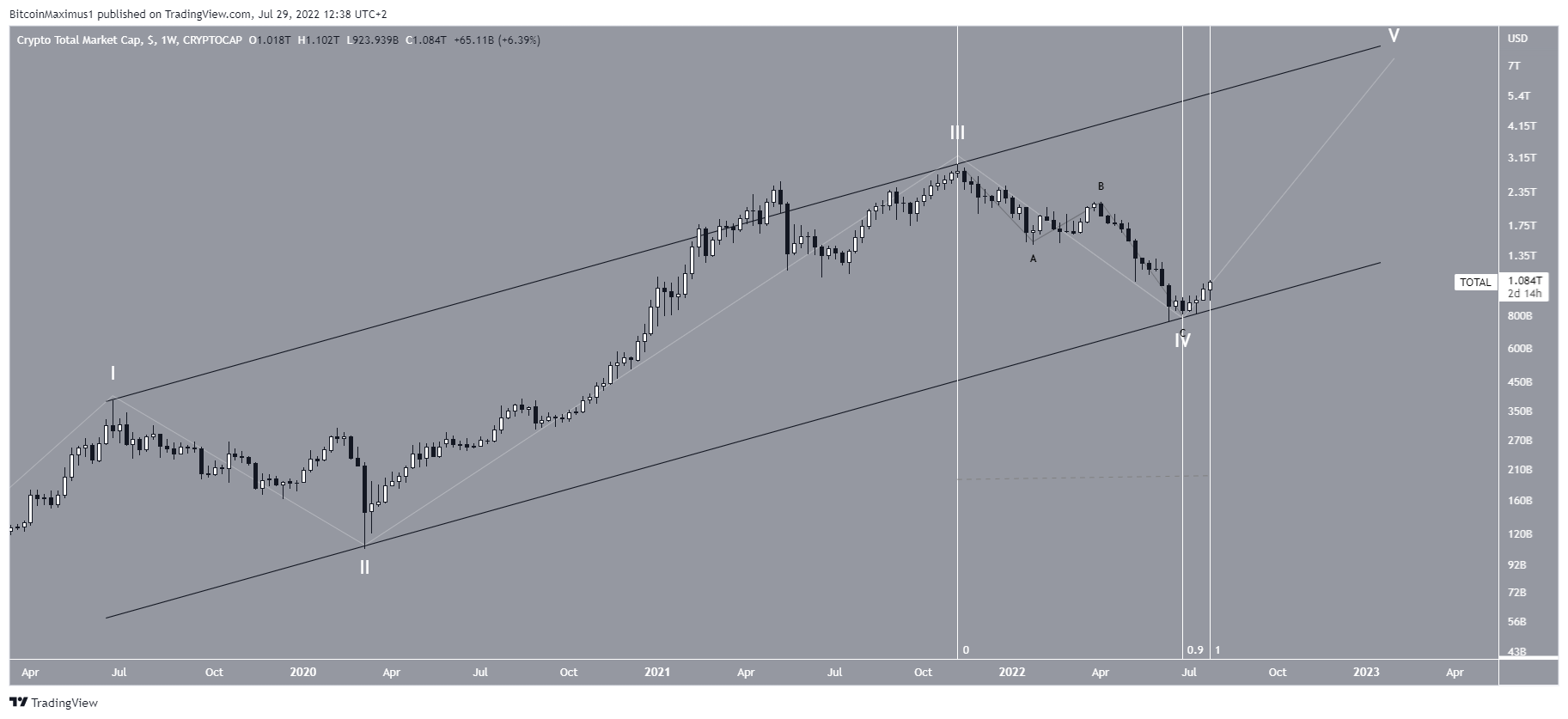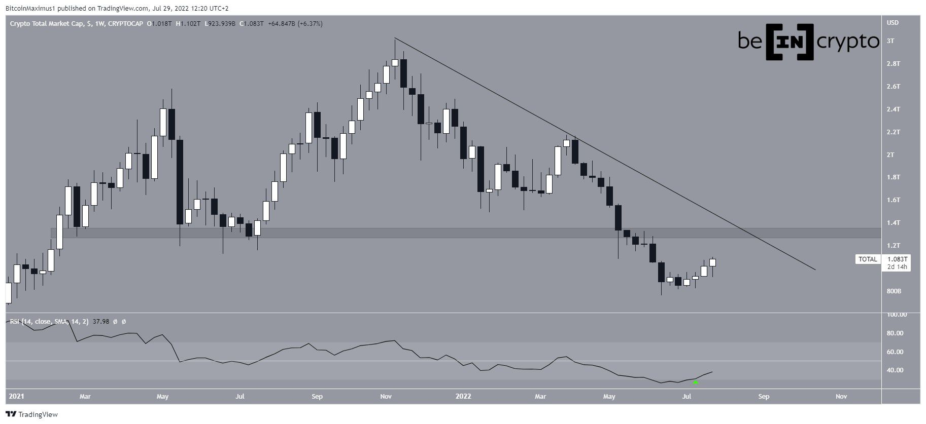 O TOTALCAP vem subindo desde então, aumentando acima de US$ 1 trilhão em 29 de julho. Isso também fez com que o RSI semanal saísse de seu território de sobrevenda (ícone verde).
