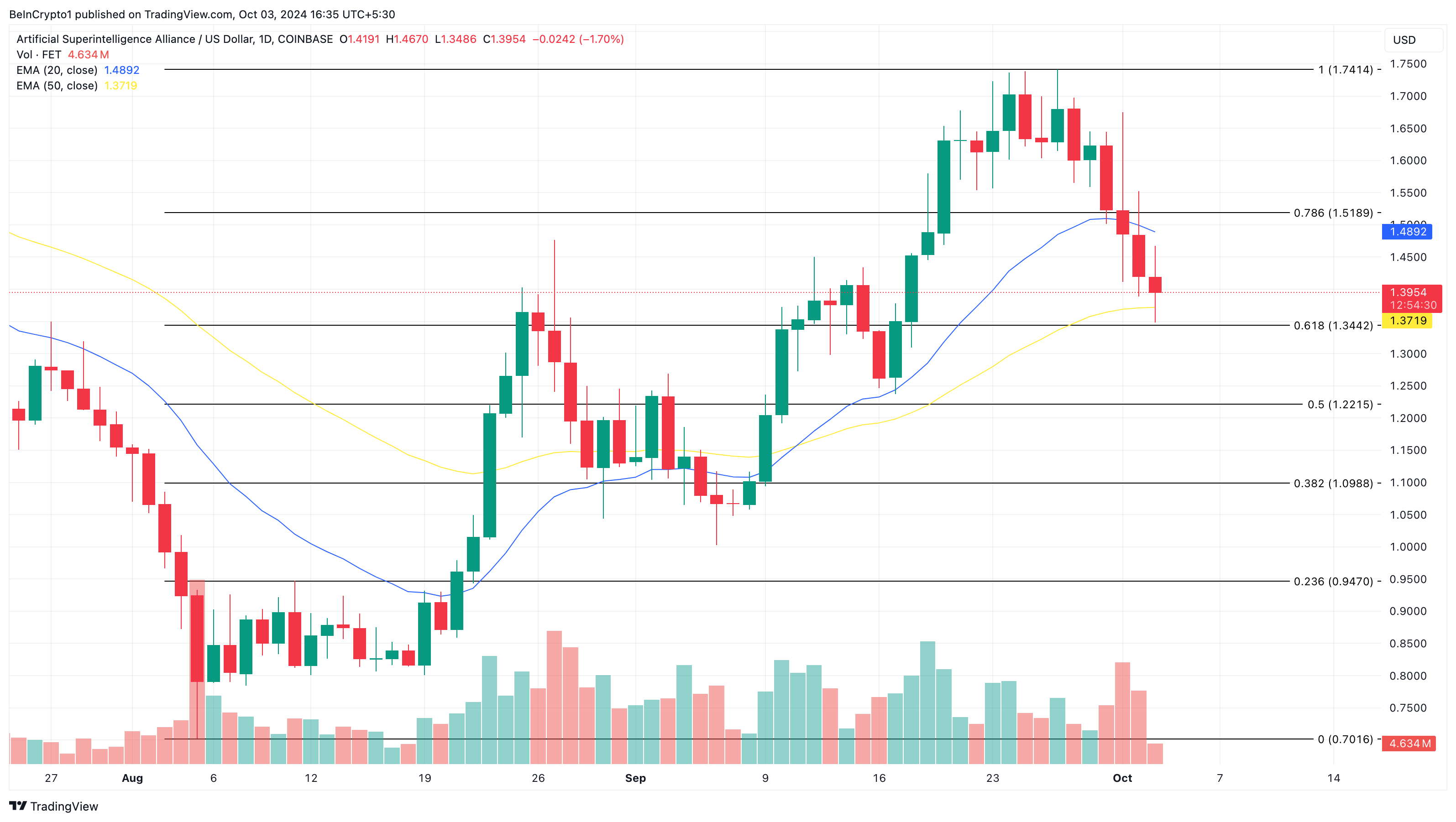 A situação do FET não é exatamente diferente ao do TAO. Até o momento, o preço do FET é US$ 1,40 e agora caiu abaixo da Média Móvel Exponencial (EMA) de 20 dias. A EMA atribui grande importância às tendências de preços recentes para medir a direção da tendência.