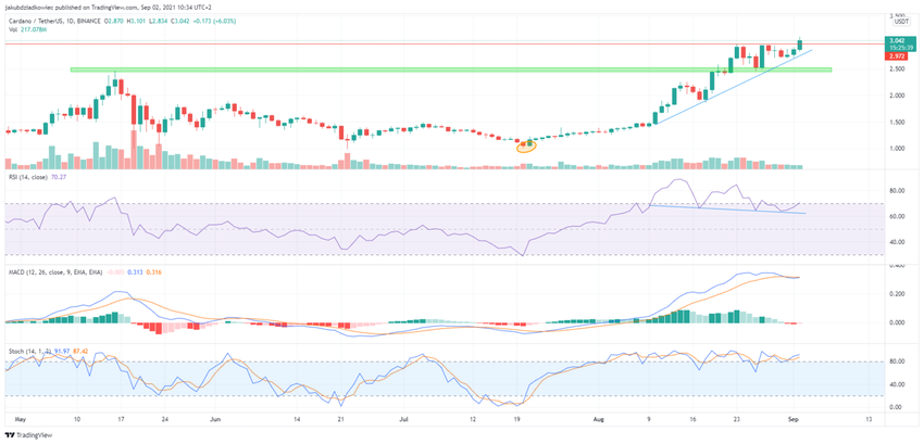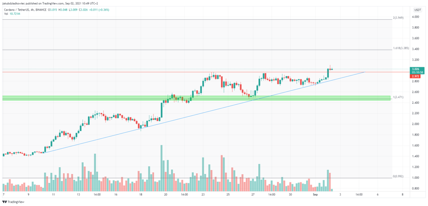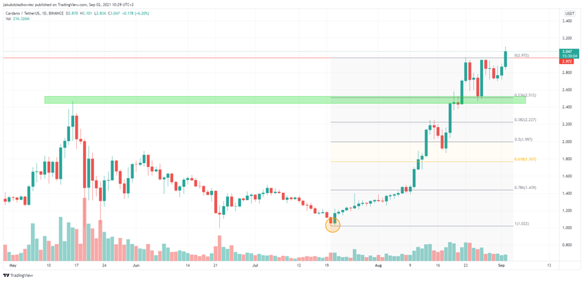 A Cardano tem crescido desde uma baixa de US$ 1,02 no dia 20 de julho (círculo laranja). No dia 23 de agosto, o ADA estabeleceu uma nova máxima histórica de US$ 2,97 (linha vermelha). Em seguida, o preço caiu, validando a máxima anterior de US$ 2,47 a partir do dia 16 de maio como suporte (área verde).