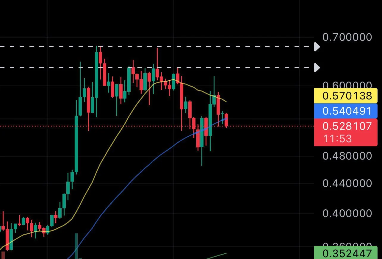 Em outubro de 2023, o preço iniciou um rápido movimento de alta, saindo da faixa no mês seguinte e atingindo uma nova máxima anual de US$ 0,68 em dezembro.