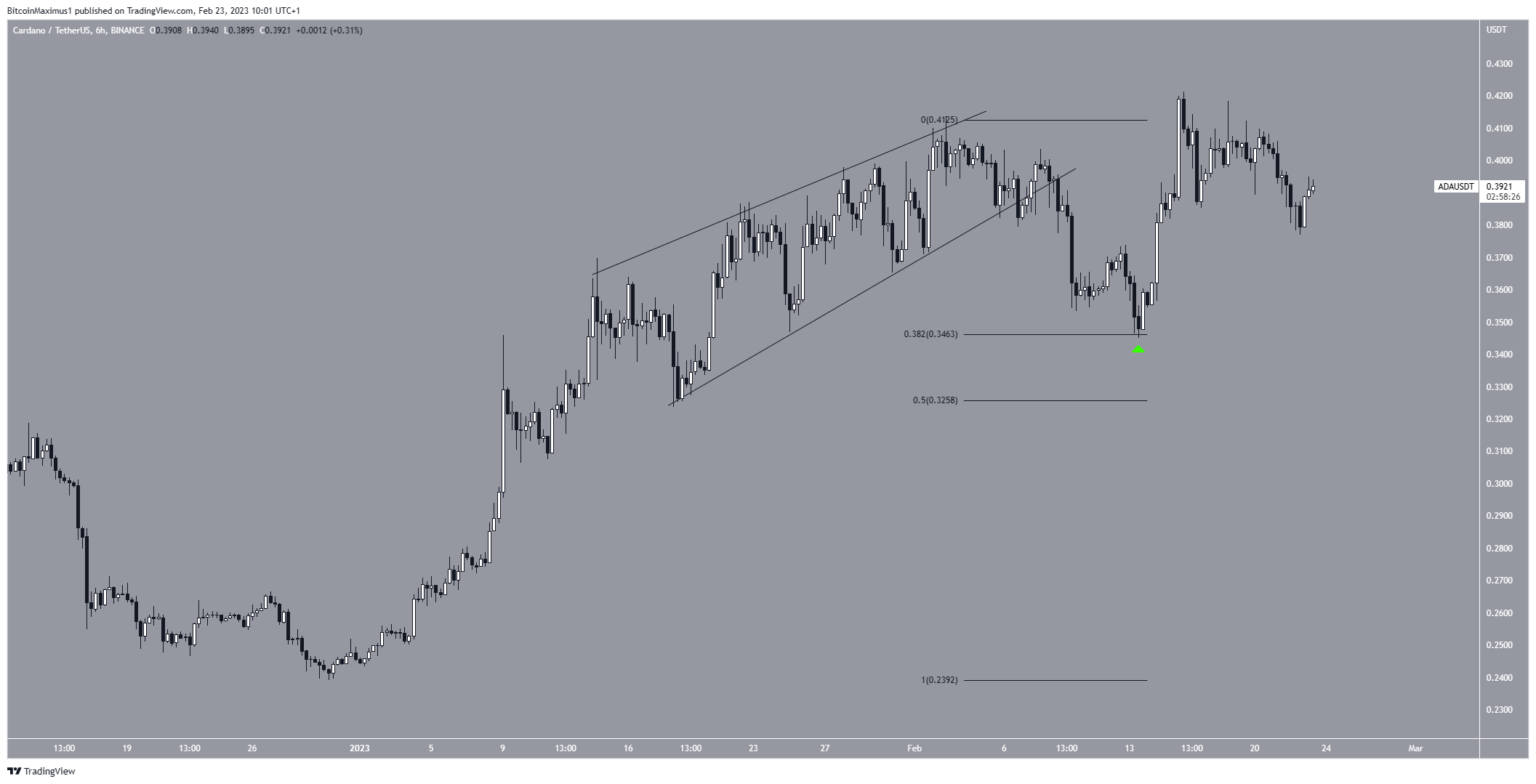 A análise técnica do gráfico de seis horas sustenta a continuação do movimento de alta. Enquanto a ADA saiu de uma cunha de alta em 9 de fevereiro, ela saltou no nível de retração 0,382 de Fibonacci quatro dias depois.