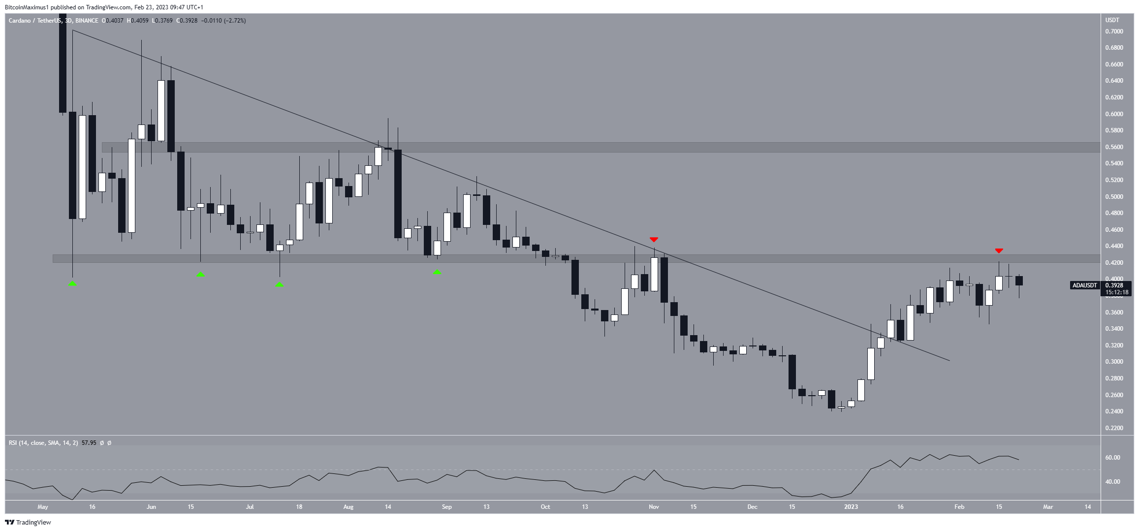 A Cardano (ADA) recuperou seu equilíbrio em 13 de fevereiro e está atualmente tentando romper acima da área de resistência de US$ 0,425.