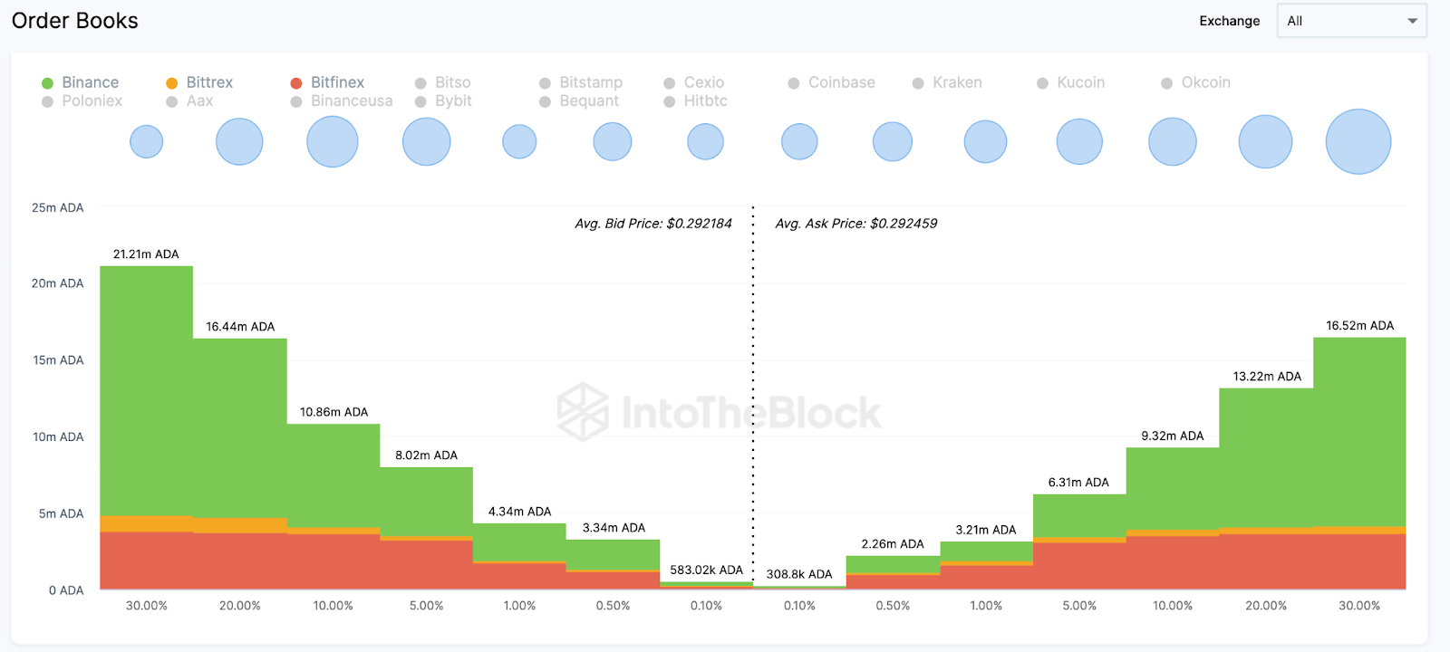 Ainda assim, os touros (compradores) podem invalidar a previsão de baixa se a ADA se recuperar acima de US$ 0,35. No entanto, os ursos montaram um sell-wall de 9,32 milhões de moedas em torno de US$ 0,32. E sem pressão de compra significativa, é improvável que o preço elimine essa resistência.