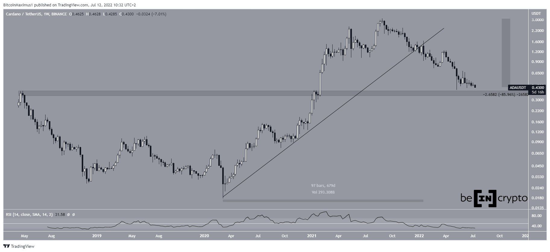 A ADA está em tendência de baixa desde que atingiu o preço recorde de US$ 3,10 em 2 de setembro. O movimento foi rápido e até agora levou a uma mínima de US$ 0,40 em 12 de maio. Ao longo da queda, o preço caiu abaixo da linha de tendência de alta , que já estava em vigor há 679 dias.