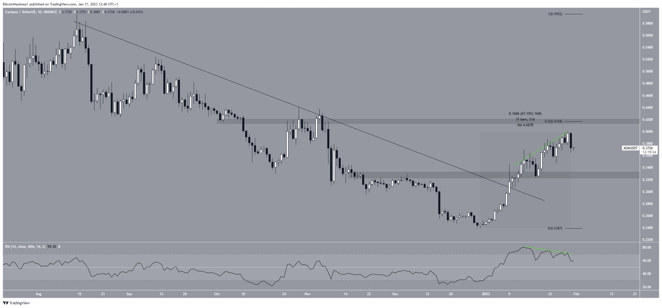 Desde o início de 2023 a Cardano está em alta e já entregou um aumento de 67%. O impulso de alta rompeu uma linha de resistência descendente e levando a ADA até US$ 0,400 em 30 de janeiro.