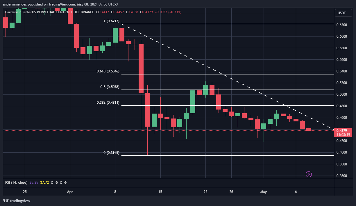 O gráfico diário mostra que a ADA sofreu uma forte queda de 35% entre os dias 9 e 13 de abril. Logo em seguida, a criptomoeda iniciou uma correção desse movimento, formando um topo pouco acima do nível de retração de 0,5 de Fibonacci em US$ 0,50.