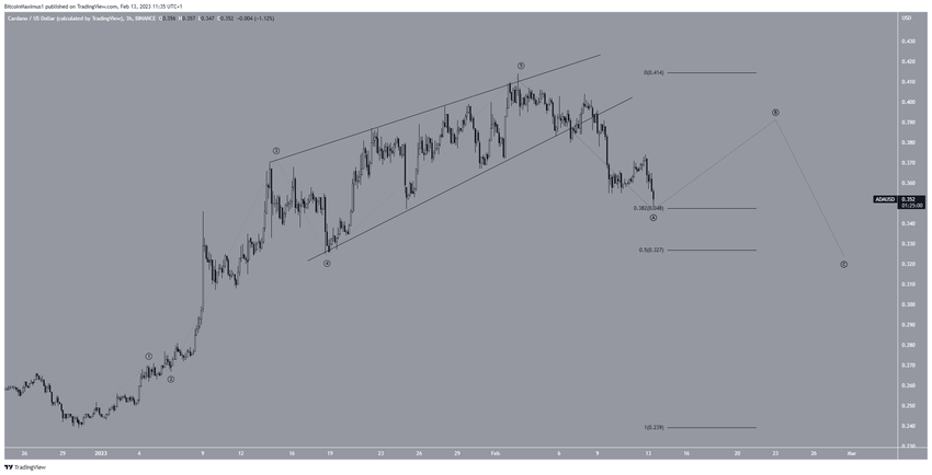 Se correto, o preço do token ADA agora está próximo do fundo da onda A em uma estrutura corretiva A-B-C. Dessa forma, ele está bem no topo da área de suporte de US$ 0,327 a US$ 0,348, criada pelo nível de suporte de retração 0,382 a 0,5 de Fibonacci. Portanto, o preço provavelmente está chegando ao fundo da onda A e logo começará uma alta de alívio.