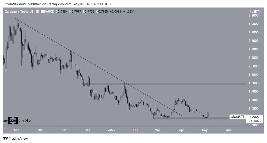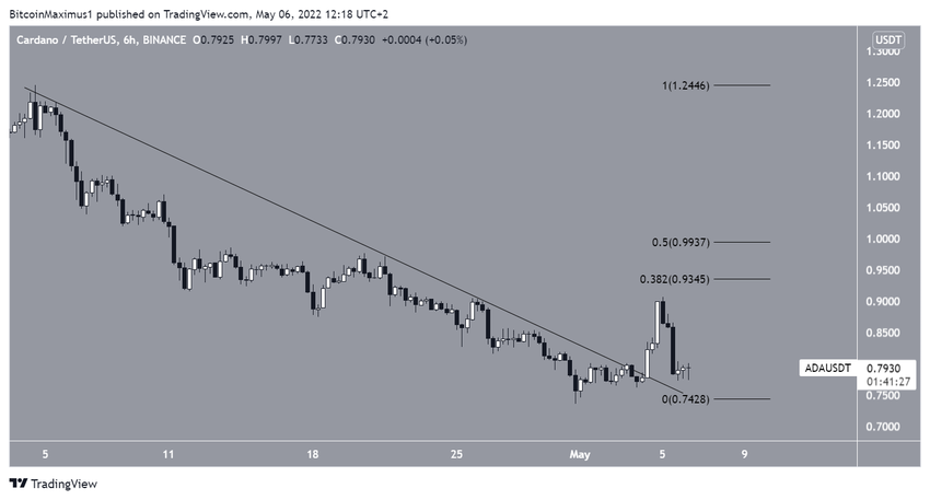 A ADA encontrou suporte neste nível e conseguiu romper a linha de tendência de baixa no dia 23 de março. No entanto, o movimento ascendente não pôde ser sustentado e o preço voltou a US$ 0,70 no início de maio. Em relação ao preço de março, isso criou um fundo duplo, que é considerado um padrão de alta.